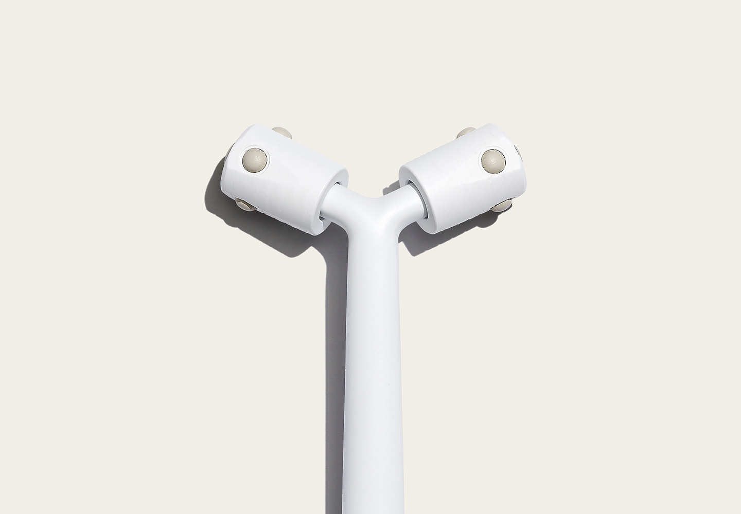 A daily face massage roller to firm the skin. The roller’s two rotating heads, each with round Bakelite beads, delivers twofold massage action for a more relaxing experience.